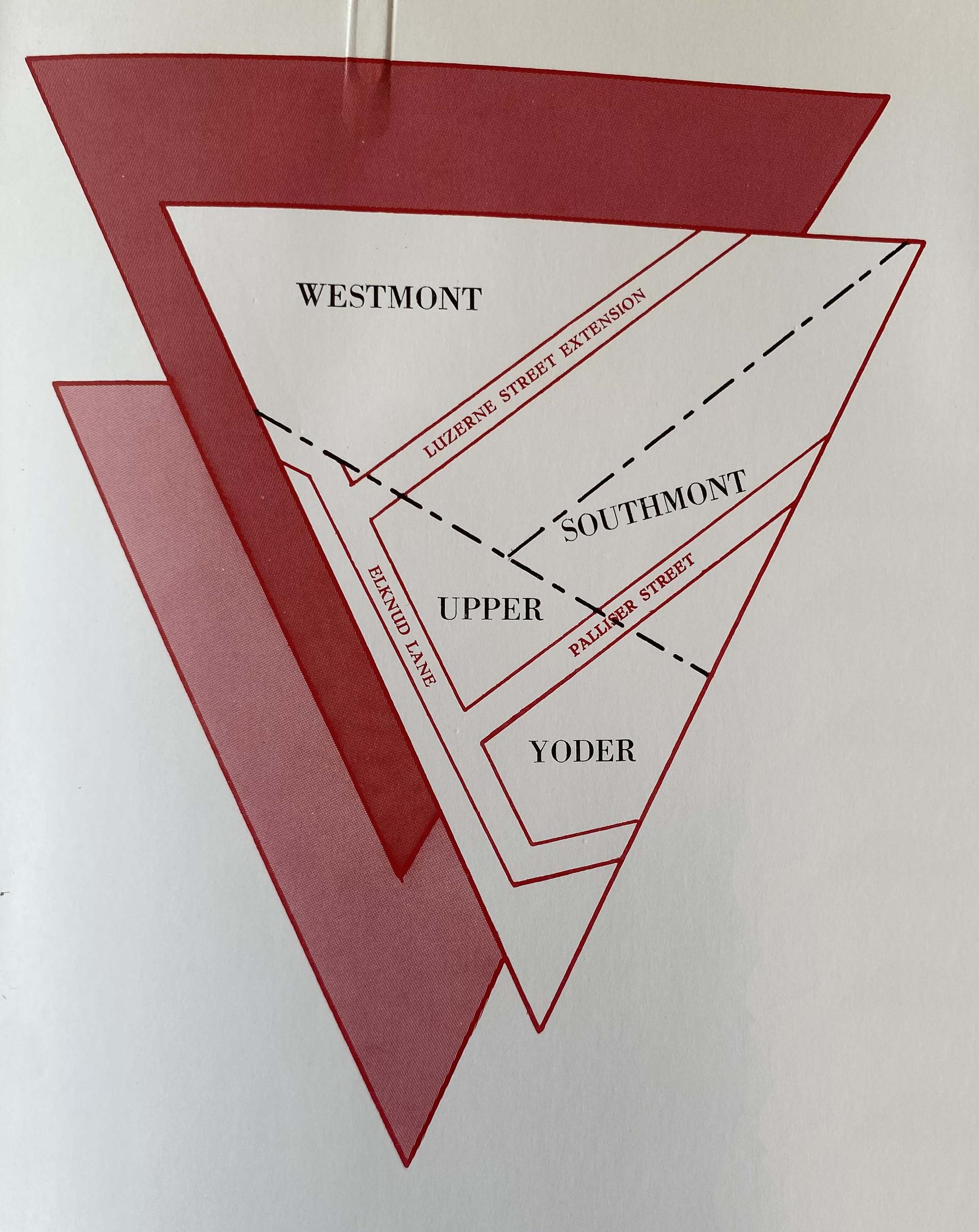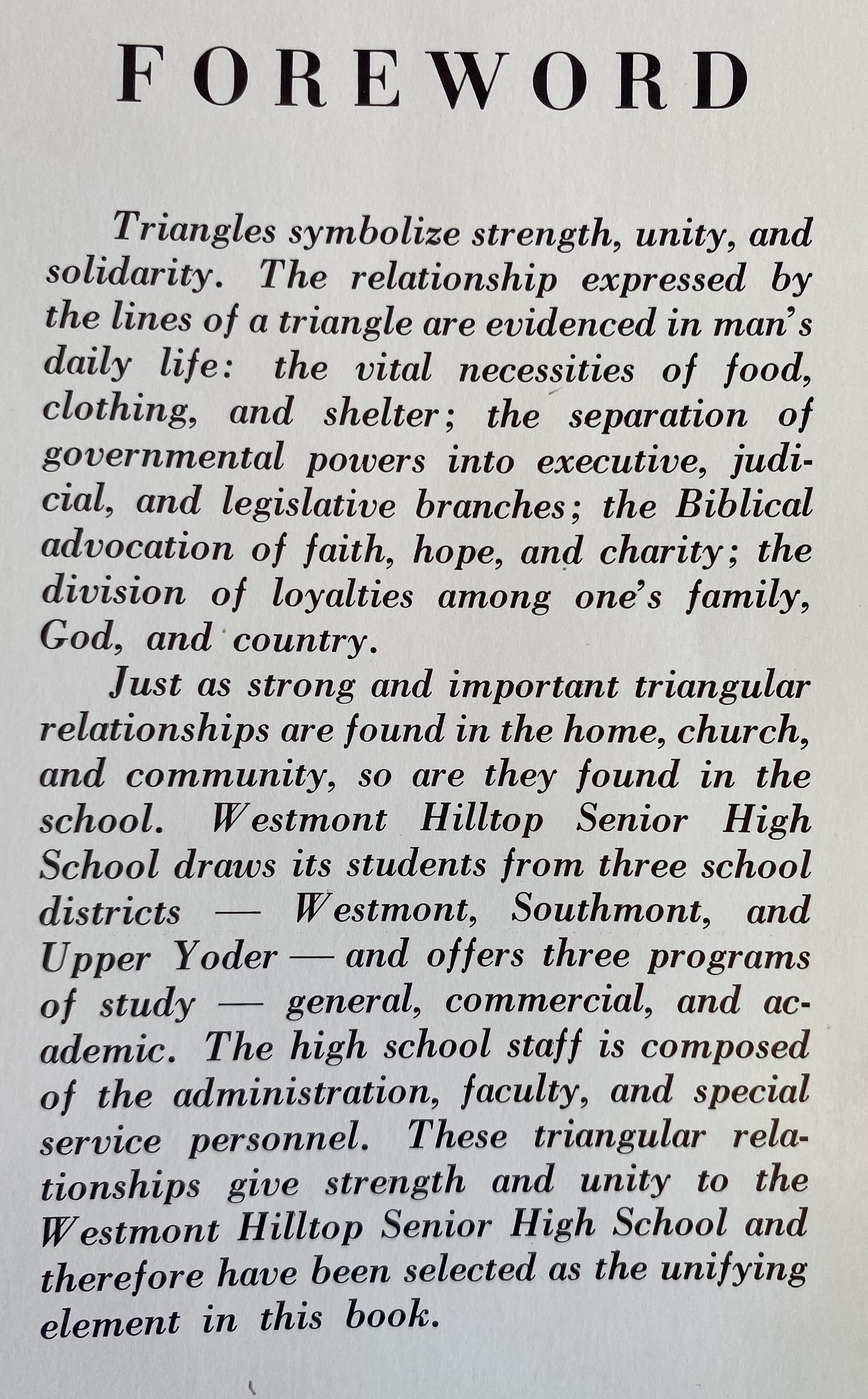 WH helped the Class develop a new logo to apply to their sponsorship. The triangle graphics below from the 1960 Phoenician depicts where the Westmont, Upper Yoder and Southmont community lines merge. This seemed a fitting inspiration to define the class logo for 1960.