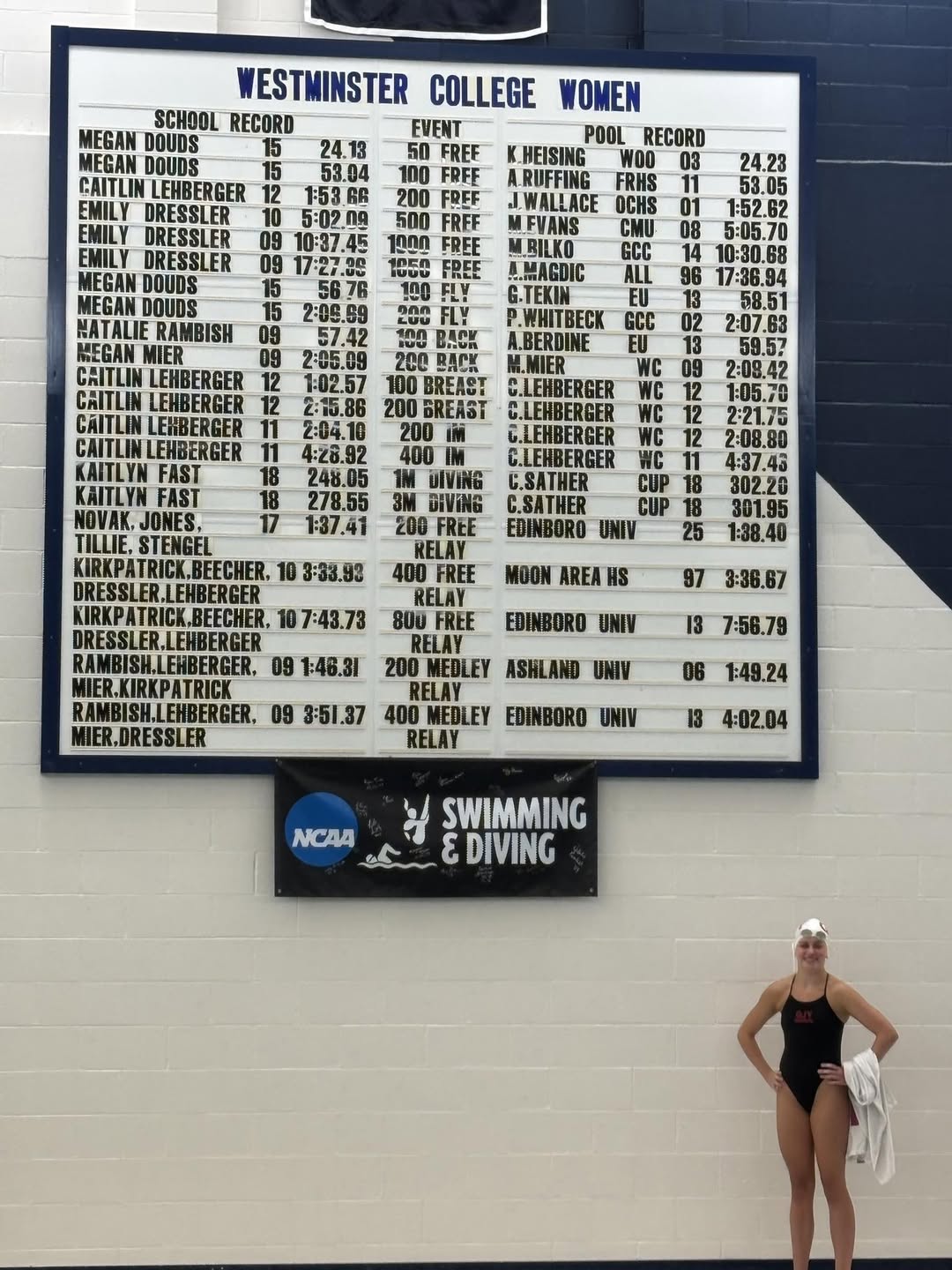 Pictured (left) after breaking the pool record at Westminster College in the 100 back, Rylee's 3rd collegiate pool record! Stay tuned for more from this rising star!